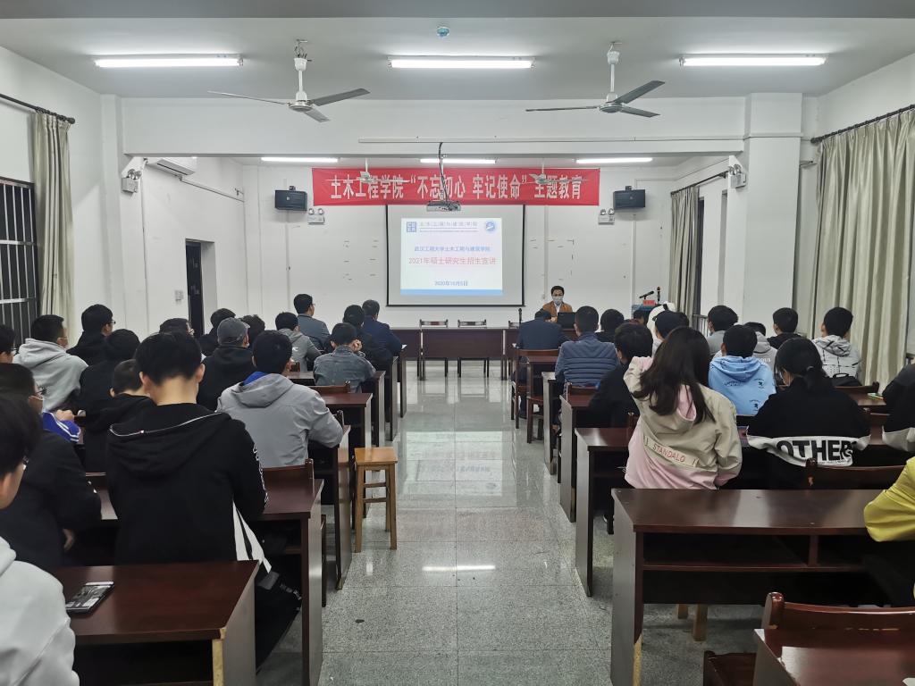2020年10月5日晚上19:30,武汉工程大学土木工程与建筑公司领导一行到公司开展2021年硕士研究生招生工作宣讲会,公司组织2021届本科毕业生中有意愿报考硕士研究生的同学前往宣讲会现场咨询。此次宣讲活动在天工楼504多媒体教室举行。