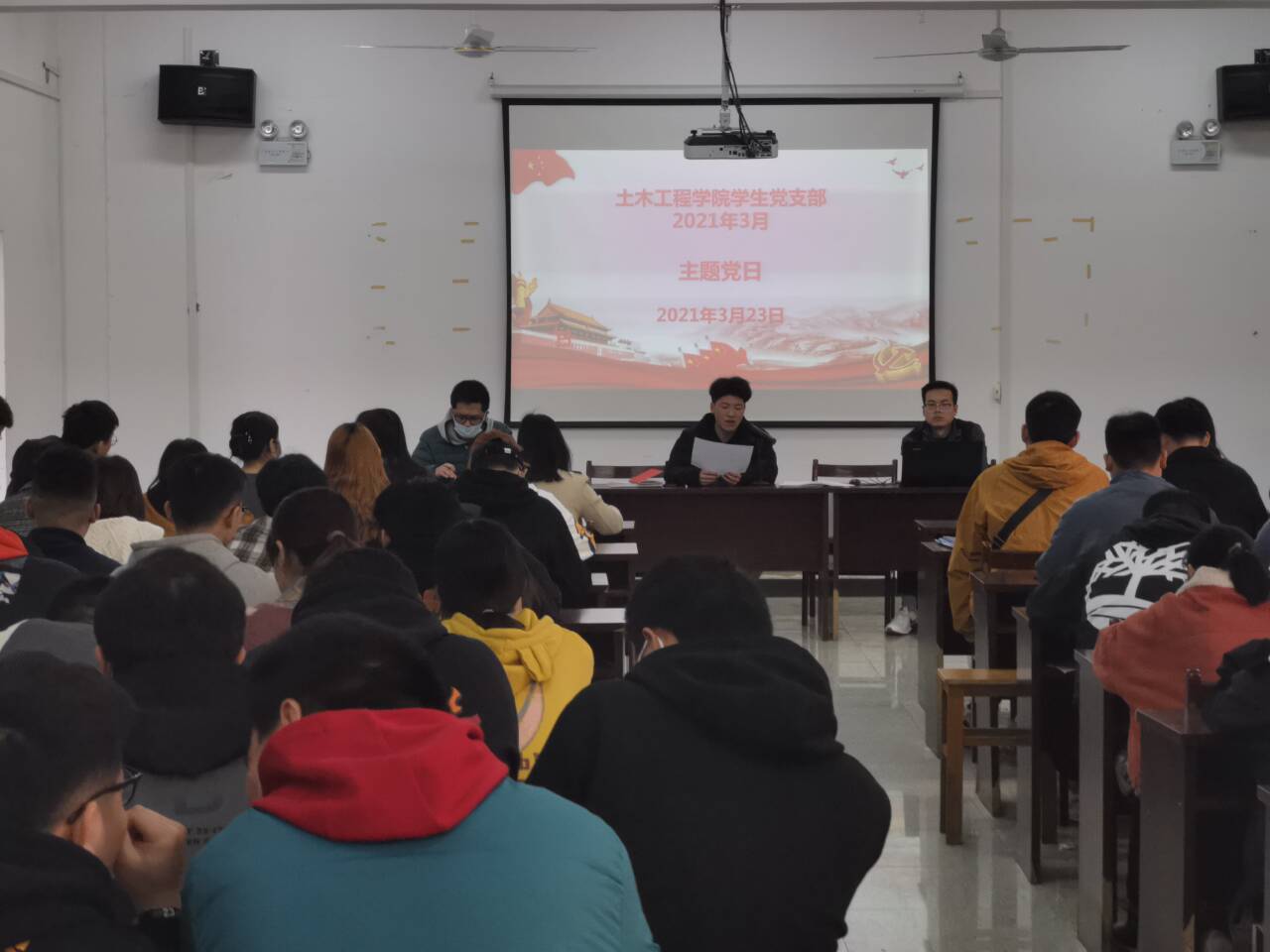 按照主题党日的要求,会上依次进行交纳党费,重温入党誓词,集体诵读党章的活动。随后由周航老师带领全体党员学习贯彻习近平总书记在党史学习教育动员大会上的重要讲话精神、学习全国两会精神的相关内容;并开展了“党员不能信仰宗教”专题教育活动,重点学习领会习近平总书记关于宗教工作的重要论述。
