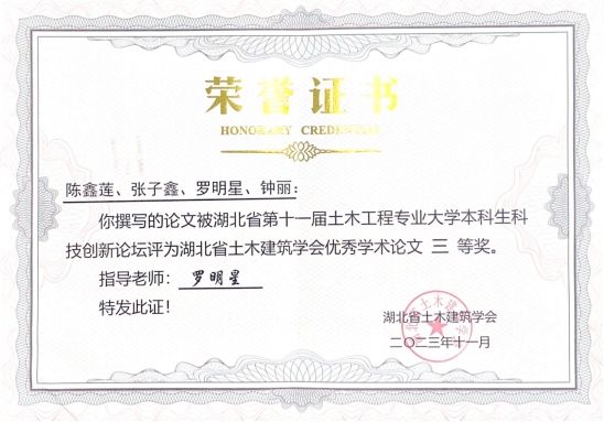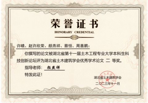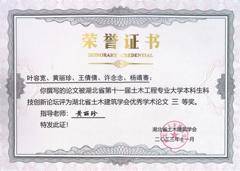 此次WilliamHill体育共派出了五组队伍参赛,与来自武汉大学、华中科技大学、武汉理工大学、武汉科技大学等省内高校土木工程专业的60余支参赛队伍展开了激烈的角逐。最终评选的湖北省土木建筑学会优秀学术论文获奖名单中,公司学子获二等奖1项、三等奖2项。其中,颜燕祥老师指导的许晴、赵许欣荣、周善鹏参赛团队荣获二等奖,黄丽珍老师指导的叶容宽、王倩倩、许念念、杨靖骞参赛团队荣获三等奖,罗明星老师指导的陈鑫莲、张子鑫参赛团队荣获三等奖。