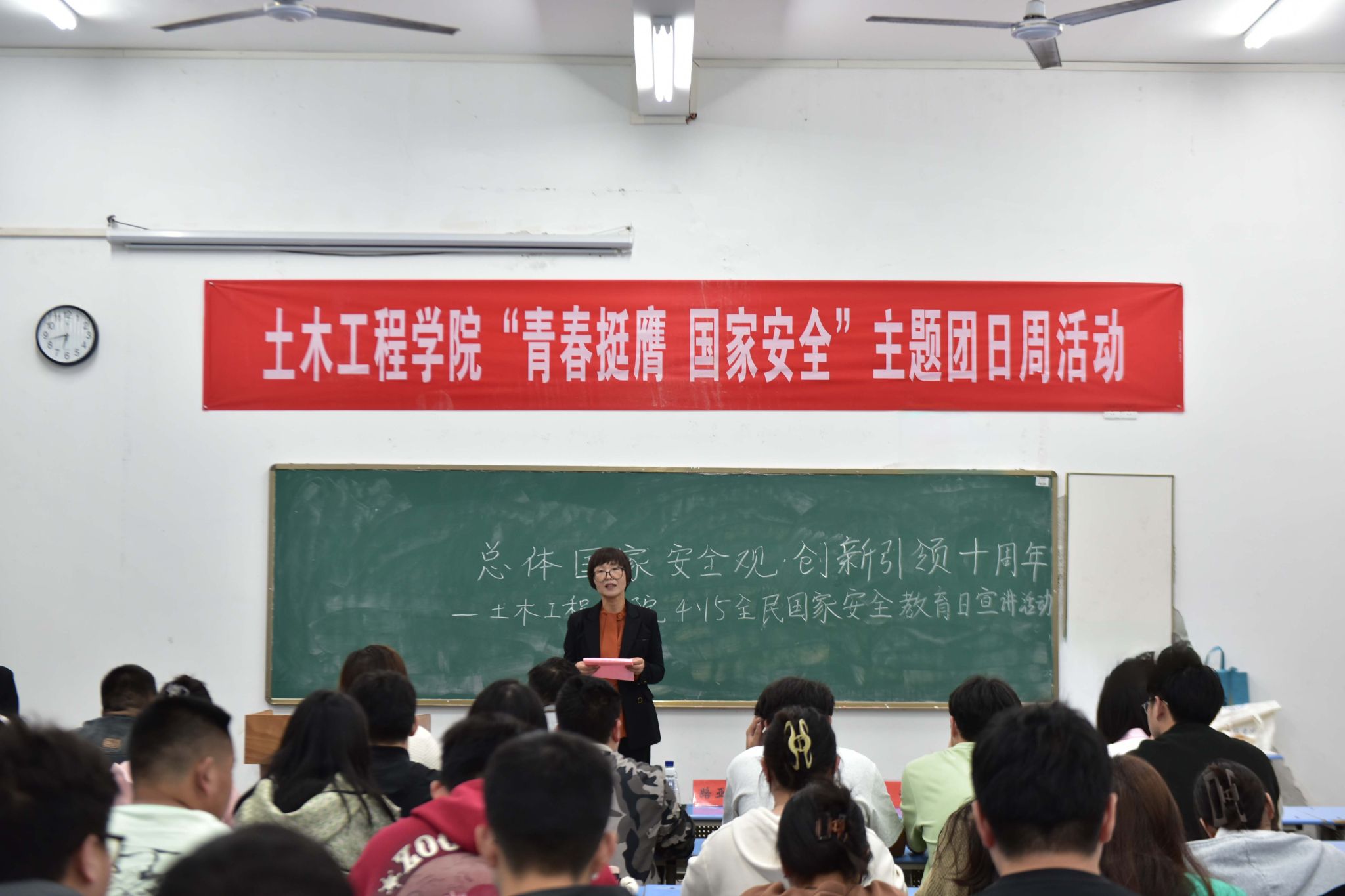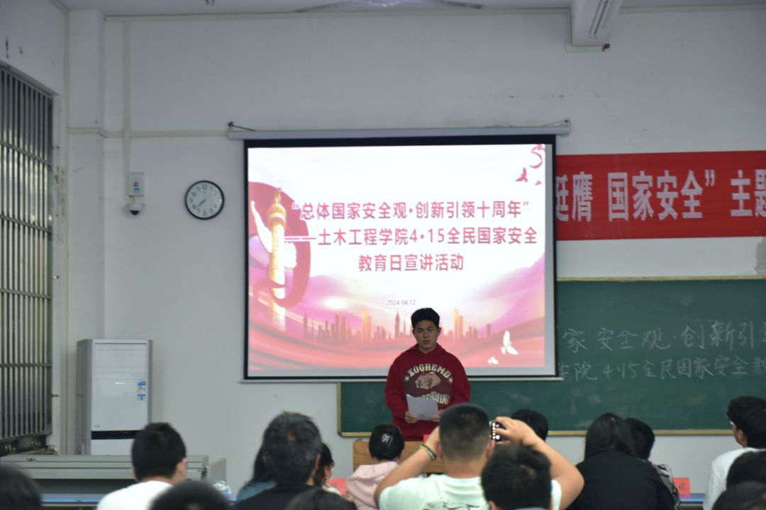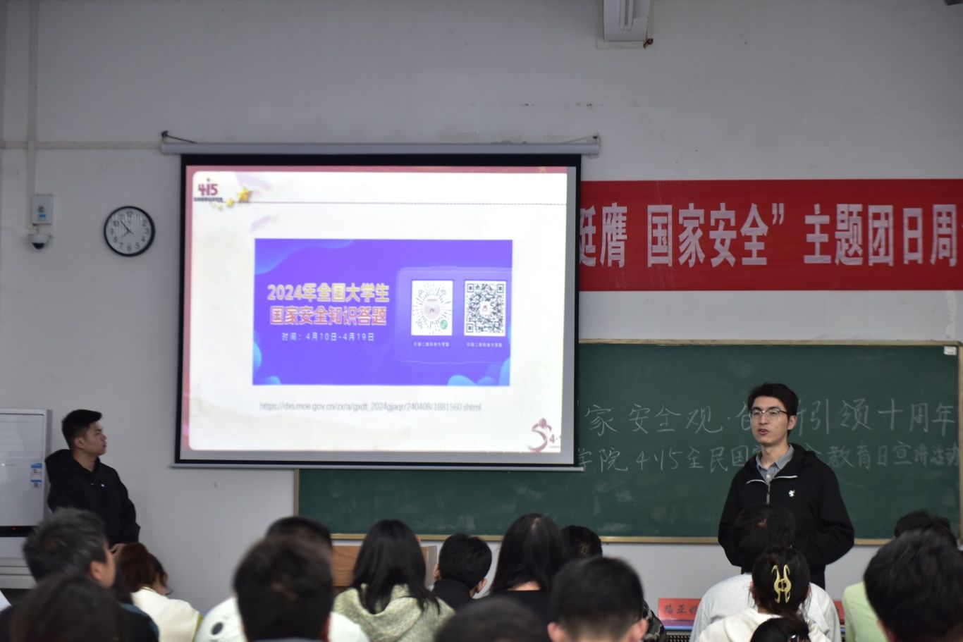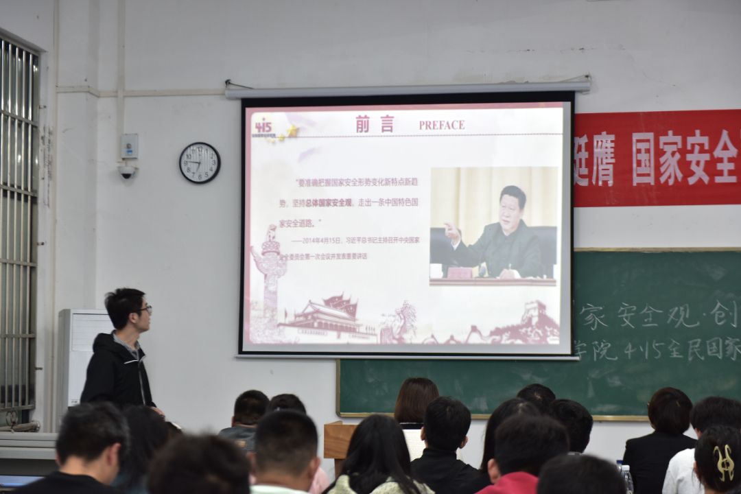 随后,辅导员洪迪老师为大家进行宣讲。他首先讲解了全民国家安全教育日的由来、国家安全的基本知识,并立足习近平总书记关于总体国家安全观的重要指示精神,结合实际案例讲解了总体国家安全观的核心要义和党的二十大报告关于国家安全的重要论述,强调在百年未有之大变局之下,探讨国家安全的重要性,引导同学们重视国家安全,树立国家安全意识,防患于未然,为国家安全稳定、社会发展贡献青春力量。他还从防范电信诈骗、网络安全等方面,提醒大家要增强网络鉴别能力,防范网络诈骗,重视人身财产安全防护。同时,还要提高网络安全素养,不轻信网络谣言,不传播不实信息,共同维护网络空间的清朗和稳定。