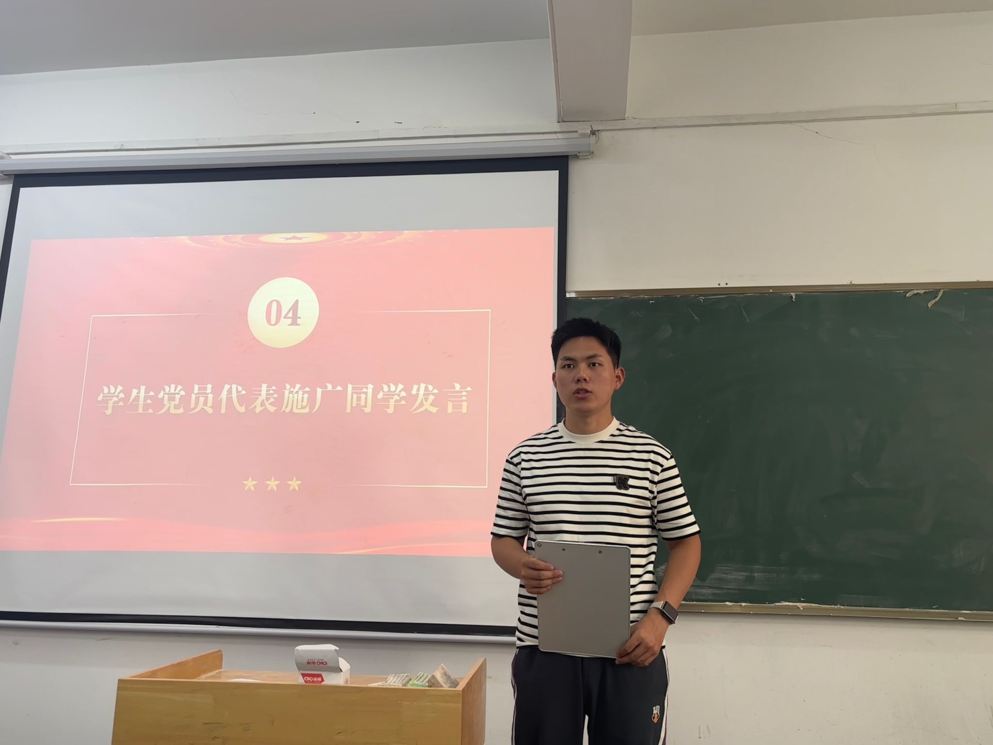 员工第三党支部组织委员施广,结合自身入党历程以及军旅生活,分享了对于党的深刻认知。他期望同学们能够坚定理想信念,明确入党动机,明晰奋斗目标,不畏艰苦,奋勇向前,在学习、工作和生活中充分发挥积极分子的模范带头作用,持续取得崭新的成绩。
