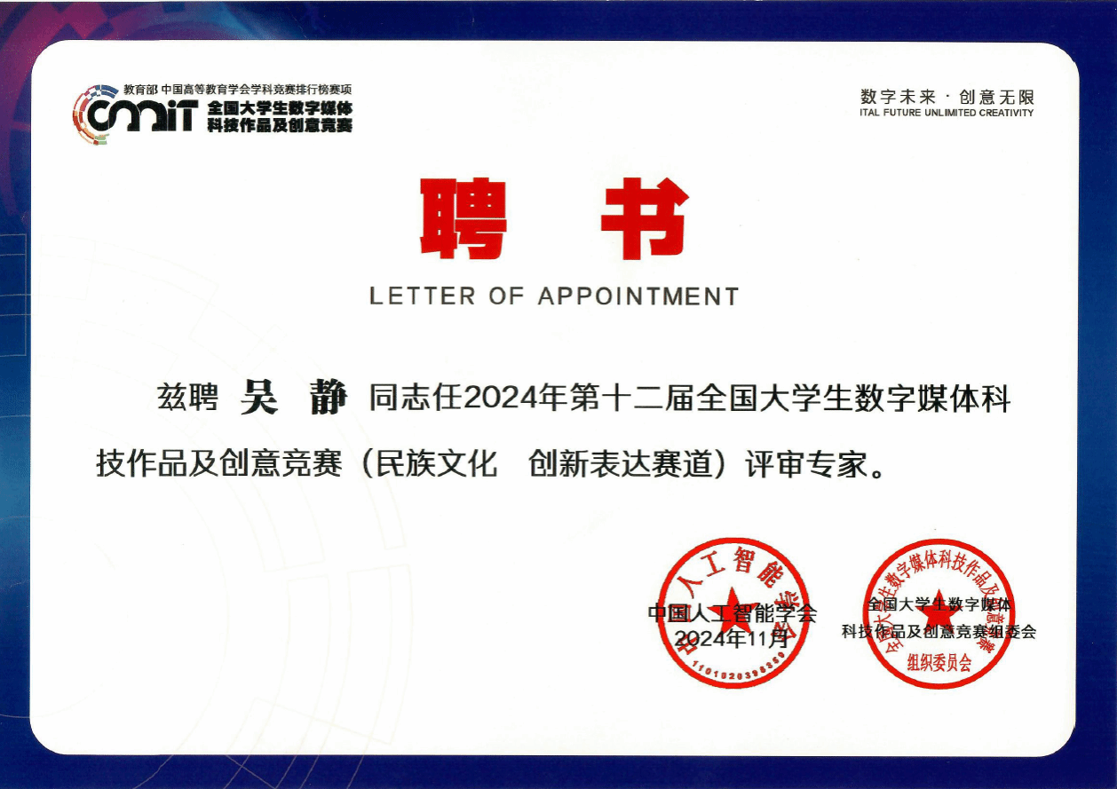 本次竞赛评审工作于2024年11月1日至4日在湖北恩施举行,由中国人工智能学会全国老员工数字媒体作品及创意竞赛组委会主办,湖北民族大学承办。吴静博士以其深厚的专业素养和实践经验,作为评审专家团队的一员,与来自全国各地的同行一起,对参赛作品进行了公正、细致的评审。