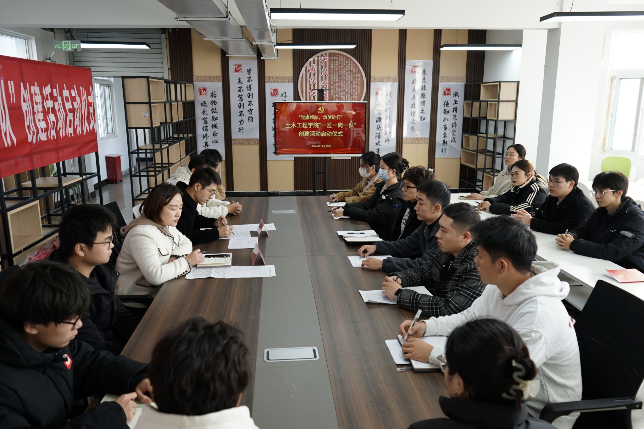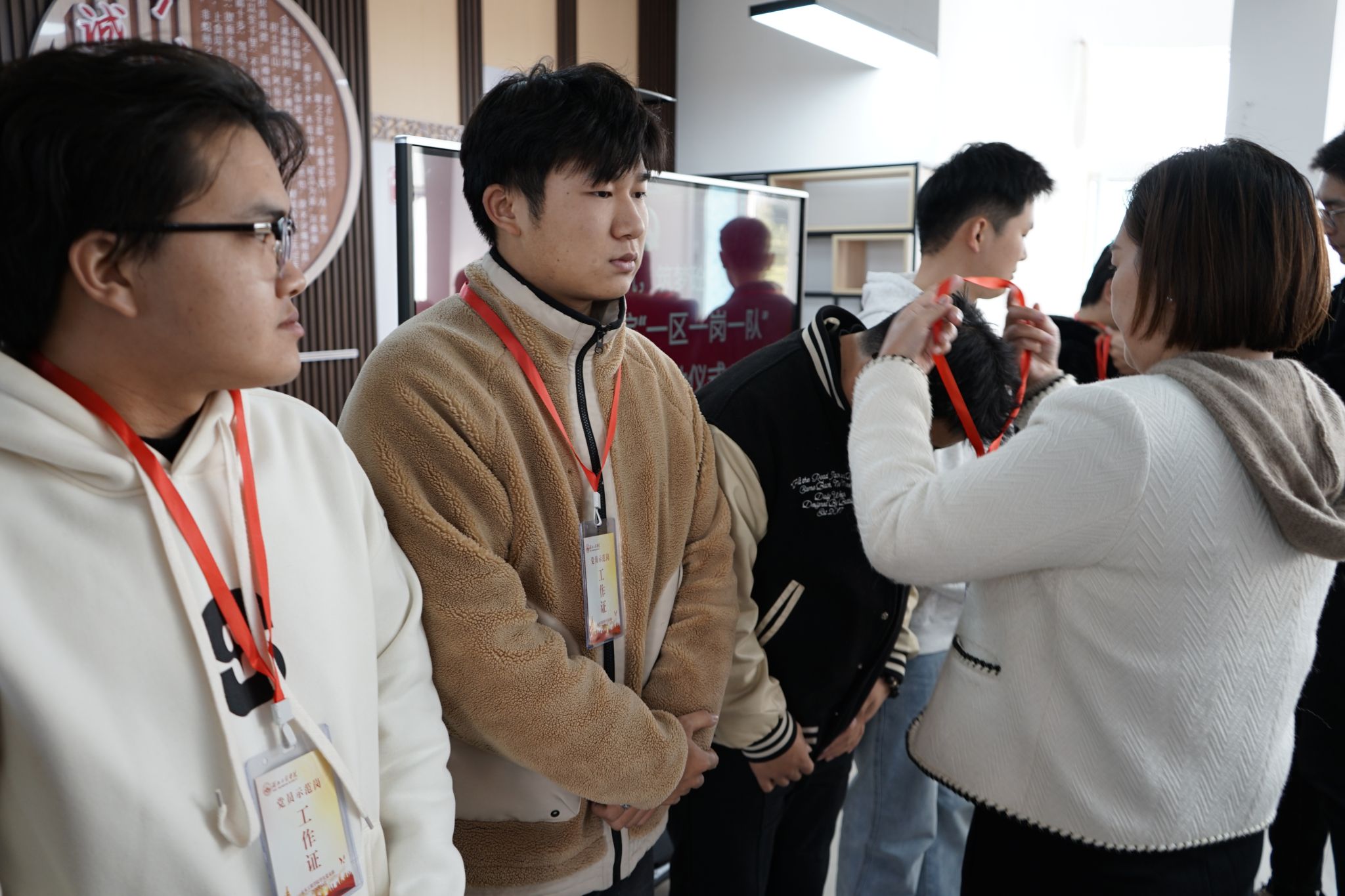 随后,老师为率先加入党员示范岗的党员代表挂牌,正式宣告入职。党员示范岗成员逐一表态,大家表示,将时刻以一名合格党员的标准严格要求自己,始终以饱满的热情和坚定的信念,全程全情全力投入到“一区一岗一队”创建活动中,为同学们提供更加贴心、实际、及时、有效的服务和帮助,为公司发展和同学成长贡献力量。