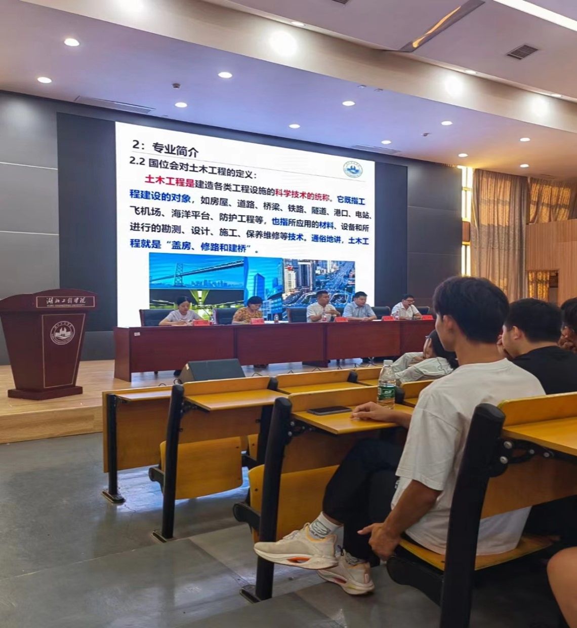 本次会议由土木工程系支部书记吴静老师主持,外聘教师中科路桥设计院副经理刘兴军、湖北亿岩工程勘测有限公司董事长张艳杰、颜燕祥老师主讲,土木工程专业新生全体班主任、教师代表及土木工程专业全体新生参加。