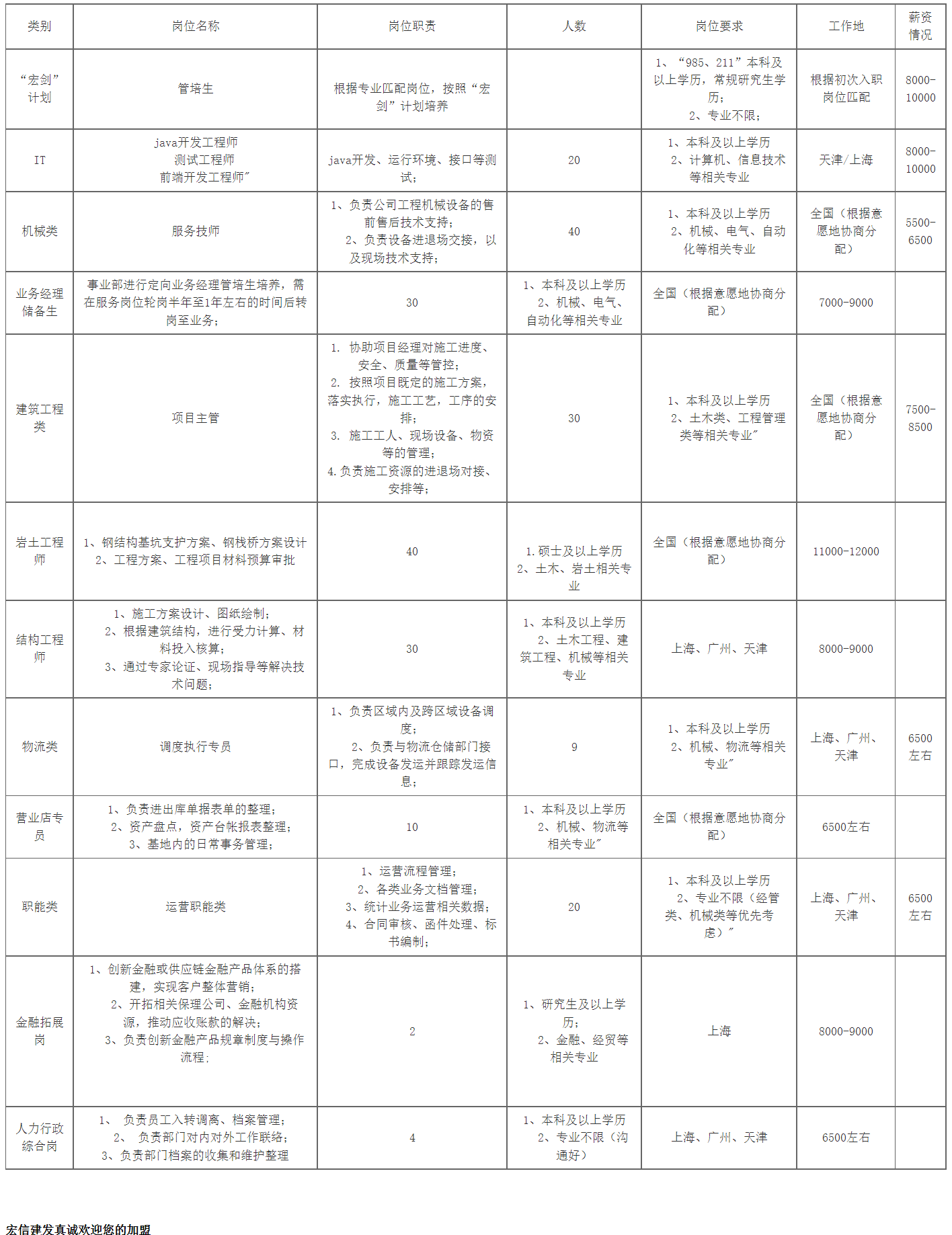 “宏剑”计划是宏信建发的未来领袖培养计划,作为“宏信建发”在建筑领域及机械运营领域持续保持竞争力的坚实保障,旨在培养最尖端的管理人才。宏剑们将会在公司的培育下飞速成长,或走上管理干部的岗位,或承担重大战略项目研发,成为宏信建发的领军人才和核心骨干。专属培养机制,快速成长路径,具有竞争力的薪酬福利,2022届精英应届毕业生均可报名,要求双一流院校本科或常规研究生学历,专业不限;