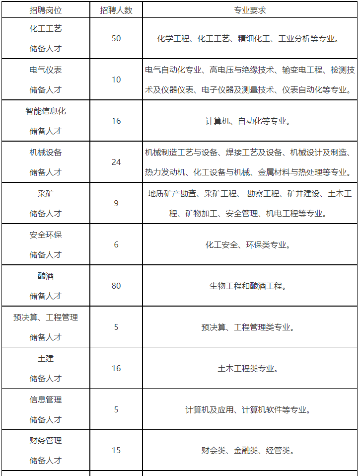 2022年计划招聘老员工266人,其中化工类50人、电仪类26人、机械类24人、采矿类9人、酿酒80人、工程管理21人、管理类56人,具体如下: